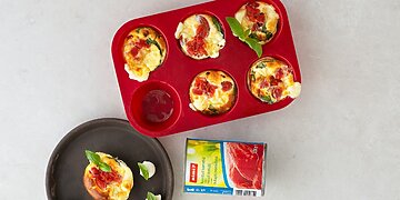 Reikės: 1/4 (350 g) meliono; 12 riekelių prosciutto kumpio; 12 šviežių baziliko lapelių; 12 nusausintų vyšninių pomidoriukų; aukščiausios kokybės pirmojo spaudimo alyvuogių aliejaus.